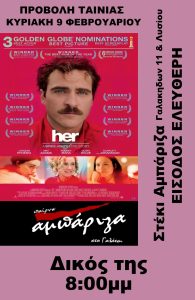 Το «Her» έχει τις βάσεις ενός υπαρξιακού μελοδράματος με ερωτική και ταυτόχρονα φουτουριστική διάθεση,δίνοντας έμφαση στον πρωταγωνιστικό ρόλο, με έναν καθηλωτικό Φοίνιξ, σε ρόλο οne man show, που όμως, με την ερμηνεία του σε κάνει να πιστεύεις ότι απευθύνεται σε δεύτερο άνθρωπο απέναντί του και όχι στην … artificial intelligent προσαρμοσμένη στις ανάγκες του βραχνή και ερωτεύσιμη φωνή της Σκάρλετ Γιόχανσον, που βγαίνει από το κινητό του.