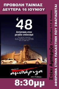 Πρόκειται για ένα πολιτικό ντοκιμαντέρ που δημιουργήθηκε αυτοργανωμένα από την Ομάδα 218 με τίτλο : ’48. Αντίσταση στον Μεγάλο Εποικισμό, μέσα από το οποίο τεκμηριώνονται απλά και ανθρώπινα οι διάφορες μορφές της καταπίεσης (που βιώνουν καθημερινά) και του αγώνα (που δίνουν αδιάκοπα) οι Παλαιστίνιοι και οι Παλαιστίνιες στη Δυτική Όχθη.