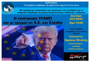 Το υπαρξιακό πρόβλημα της χώρας στην τροχιά του 21ου αιώνα στα πλαίσια της έκδοσης των πρακτικών του συνεδρίου, διοργανώνει εκδήλωση – συζήτηση με θέμα «Η επιστροφή ΤΡΑΜΠ και οι τριγμοί σε Ε.Ε. και Ελλάδα».
